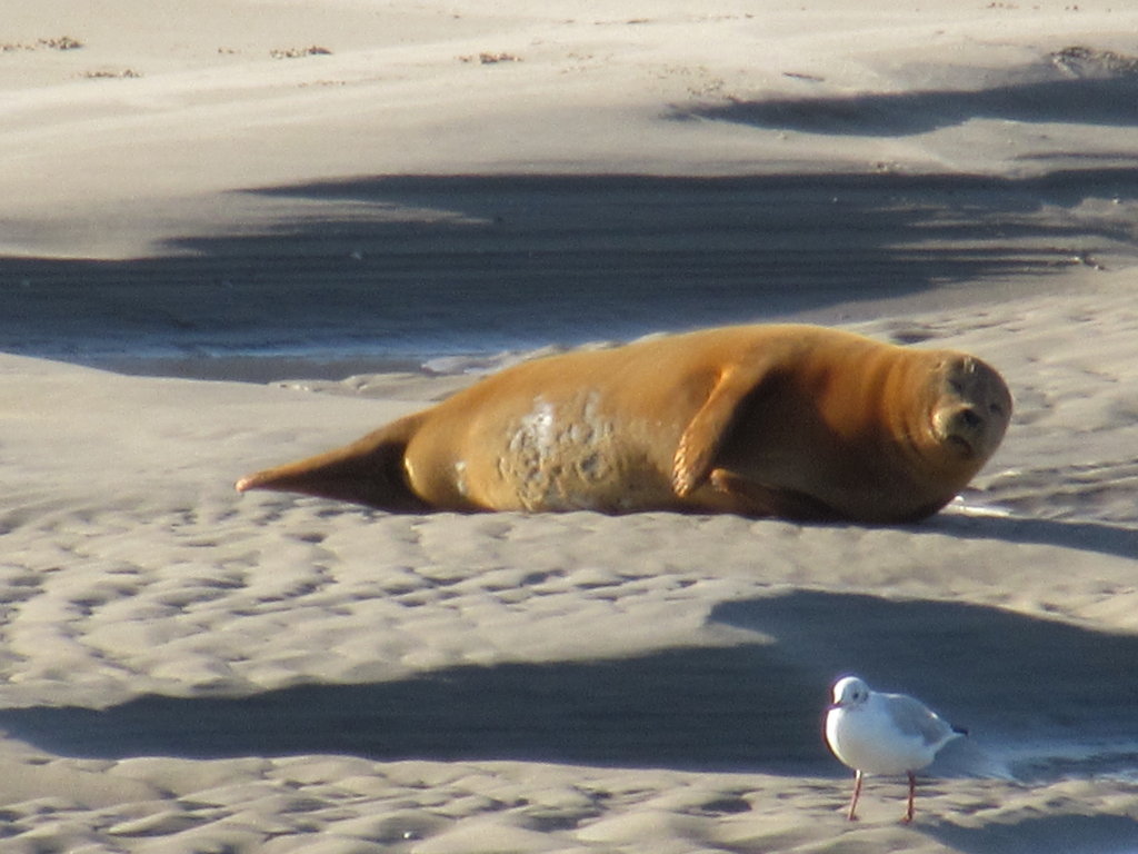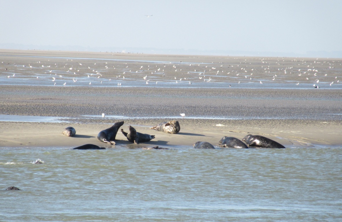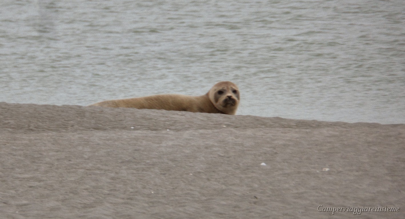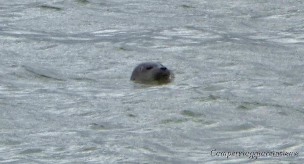 Siamo al faro di HOURDEL nella BAIE DE LA SOMME dove è possibile vedere nel loro habitat naturale le foche. E così è stato; infatti, durante la bassa marea del mattino, ecco un dolcissimo musino spuntare dalla sabbia, mentre altre due foche nuotano proprio lì vicino.