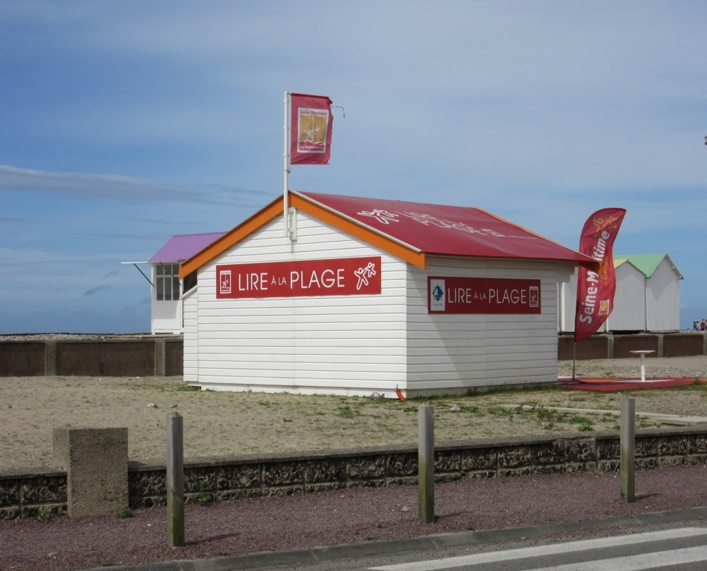 Sulla spiaggia spiccano le cabine dai tetti colorati e quella casetta bianca dal tettuccio rosso, una libreria per tutti.
