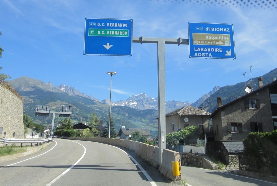 Poco dopo eccoci allo svincolo per il Monte Bianco, ma noi proseguiamo sulla destra verso Aosta e il Tunnel del Gran San Bernardo. Lasciamo l’ autostrada per prendere la Statale 27 imboccando la galleria per proseguire poi verso il passo.