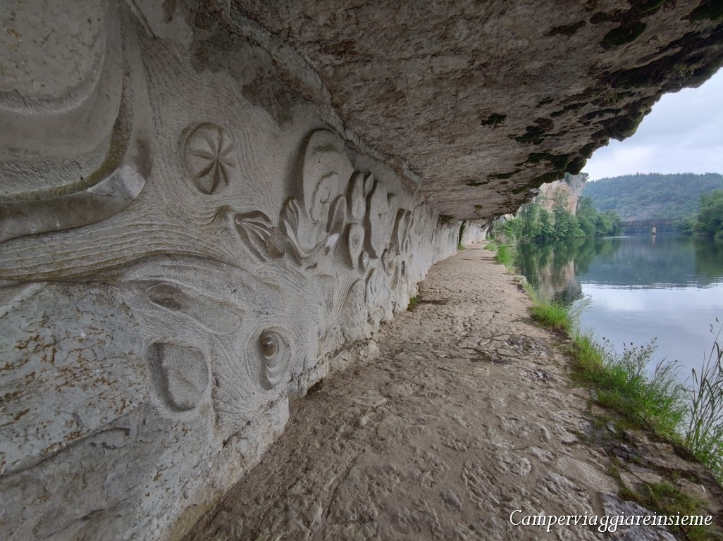 Un tratto della roccia sul lato del sentiero è impreziosito da un basso rilievo dal 1985 lungo 30 m. da un artista di Tolosa Daniel Monnier che evoca la rappresentazione del fiume e del suo ambiente.