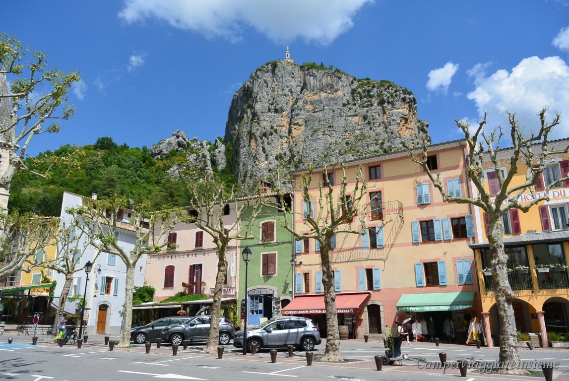 Passeggiate fra le sue strette vie, mentre nella piazza principale facilmente troverete un mercato tipico provenzale. Visitate la Chapelle Notre-Dame du Roc, abbarbicata su uno sperone della montagna, tanto che sembra dover cadere da un momento all’ altro. Possibilità di sport acquatici nel Verdon.