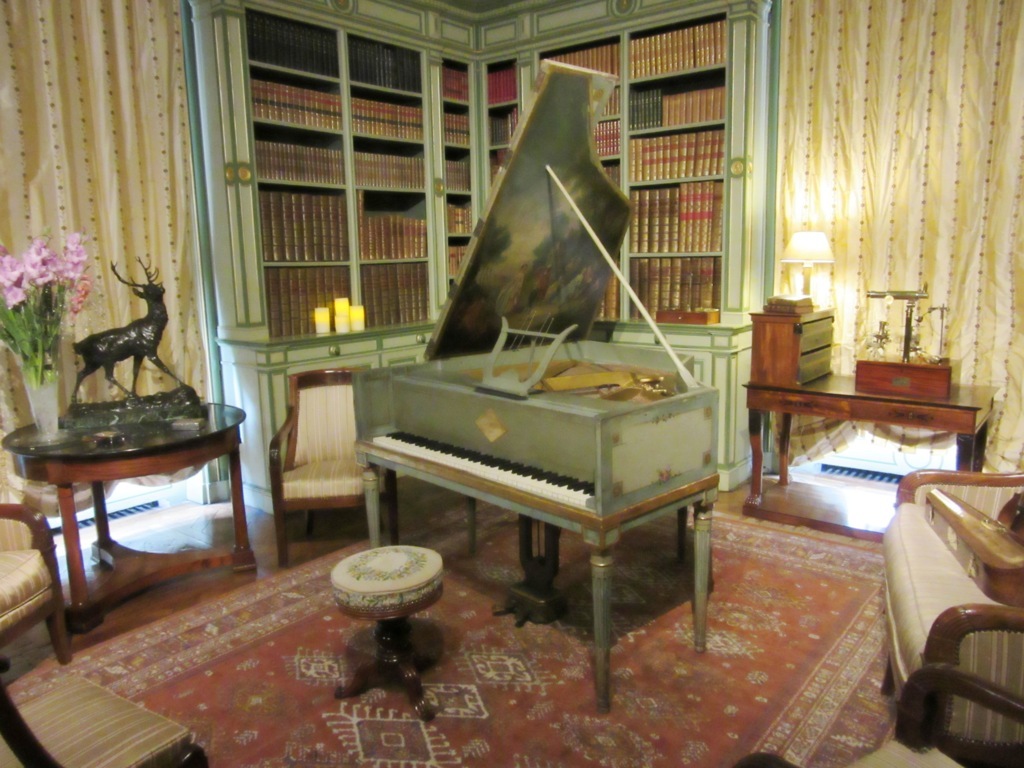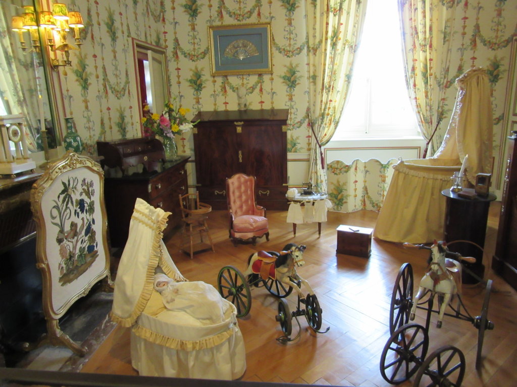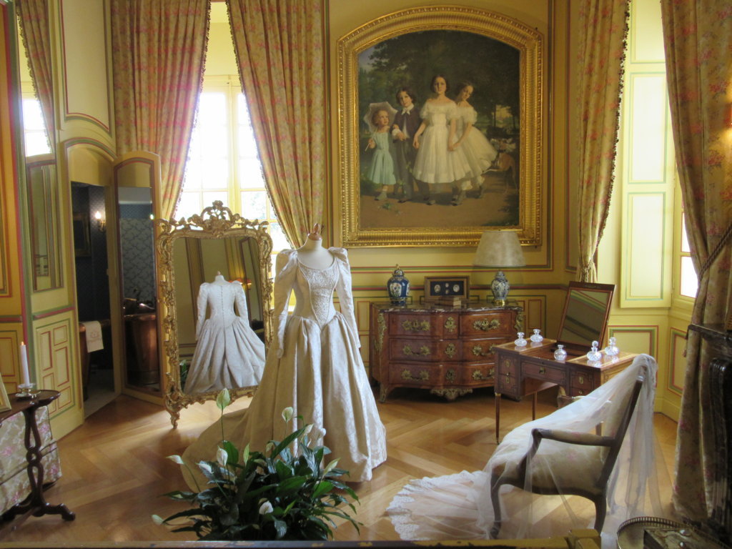 E poi la camera delle nascite con una culla molto rara in stile impero, una camera per bambini con i primi modelli di cavalli di legno d’ epoca Napoleone III, la Camera degli sposi con l’ abito da sposa della marchesa di Vibraye, la Sala della musica e la Sala delle armi.