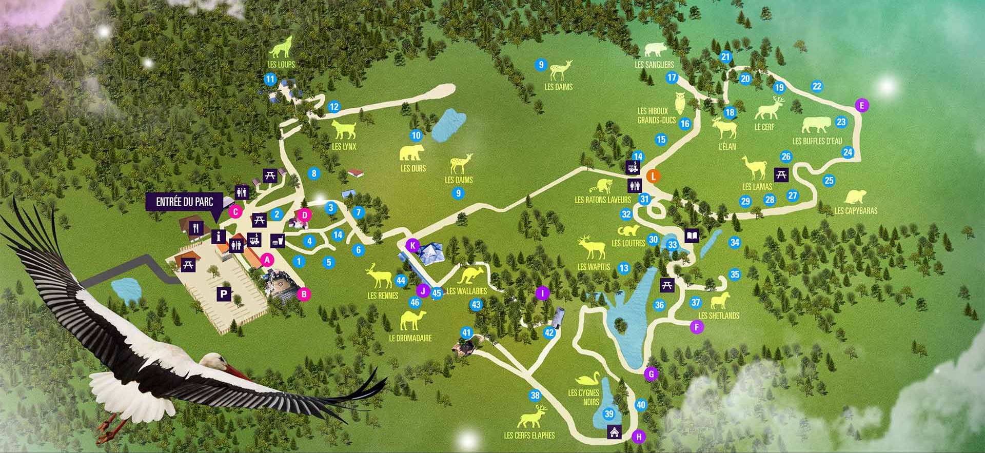 Il parco propone una moltitudine di spettacoli grandiosi nel cuore di una foresta centenaria: spettacolari combattimenti di vichinghi che attaccano un antico villaggio con i tetti di paglia, magnifici voli di rapaci nel ballo degli uccelli fantasma, sfrenati spettacoli di cappa e spada con i moschettieri di Richelieu… Gli animali sono onnipresenti e pronti ad affascinare grandi e piccoli. Il parco permette anche di varcare le porte del tempo e di attraversare una vera città medievale, un magnifico paesino del XVIII secolo e un borgo Belle Epoque del 1900…