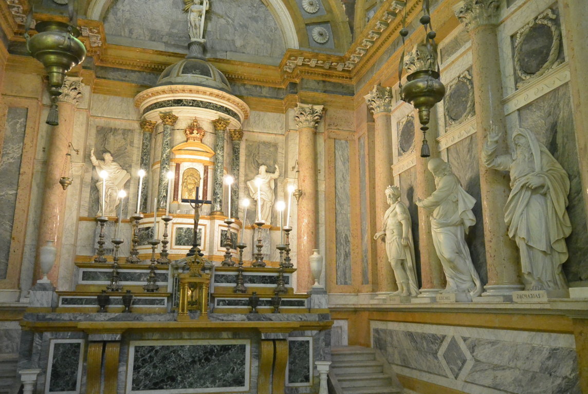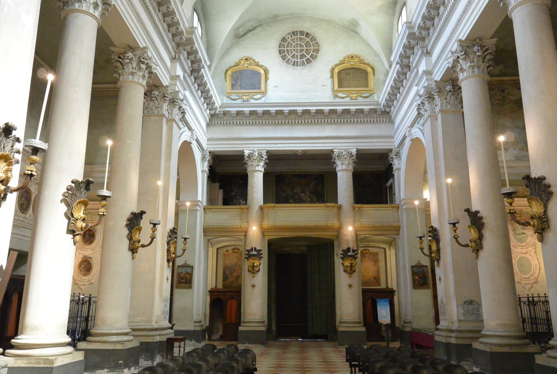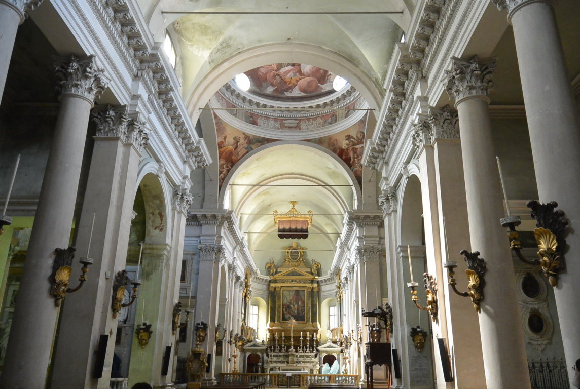 Ai lati, cinque cappelle si aprono sulle navate, tra cui spicca per importanza quella del Santissimo Sacramento progettata da Pietro Cugini, che, ricca di affreschi sul soffitto e sulle pareti, è ornata anche con preziosissimi marmi grigi d’epoca romana.