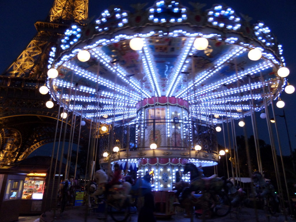 Avremmo tanto voluto salire sopra ma le code per i due ascensori erano infinite e fare i 1665 scalini davvero impensabile.     Ma è comunque alla sera che da il meglio di se stessa quando,  allo scoccare delle ore, scintilla con oltre 22.000 lampadine, e tutto diventa magia, circondata da centinaia di turisti, le giostre colorate, le tante guide della città con i loro svariati mezzi dall’ ape-car, al calesse, alle biciclette ecc ecc., e vicino i battelli sulla Senna.