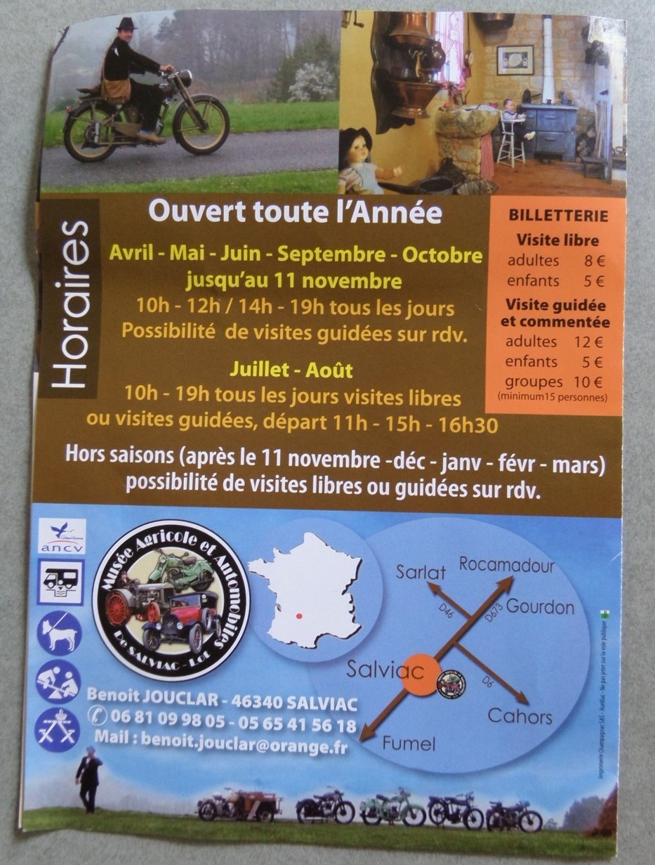 Dopo aver trascorso una buona nottata nell’ area sosta a GOURDON (Gps. 44°44’02.5″N 1°23’07.3″E – buone piazzole – gratuita – con servizi e corrente) puntiamo in direzione SAILLAC per visitare il Museo Agricolo e dell’ automobile ma non solo anche Moto- Mezzi Militari – Antichi Mestieri – Biciclette – Modellismo e poi ancora ambienti familiari, banchi di scuola, giochi dei bambini, orologi e oggetti vari. Un mondo tutto da scoprire a poco a poco ricreato da Benoit Jouclair raccogliendo dall’ età di 14 i vari reperti.