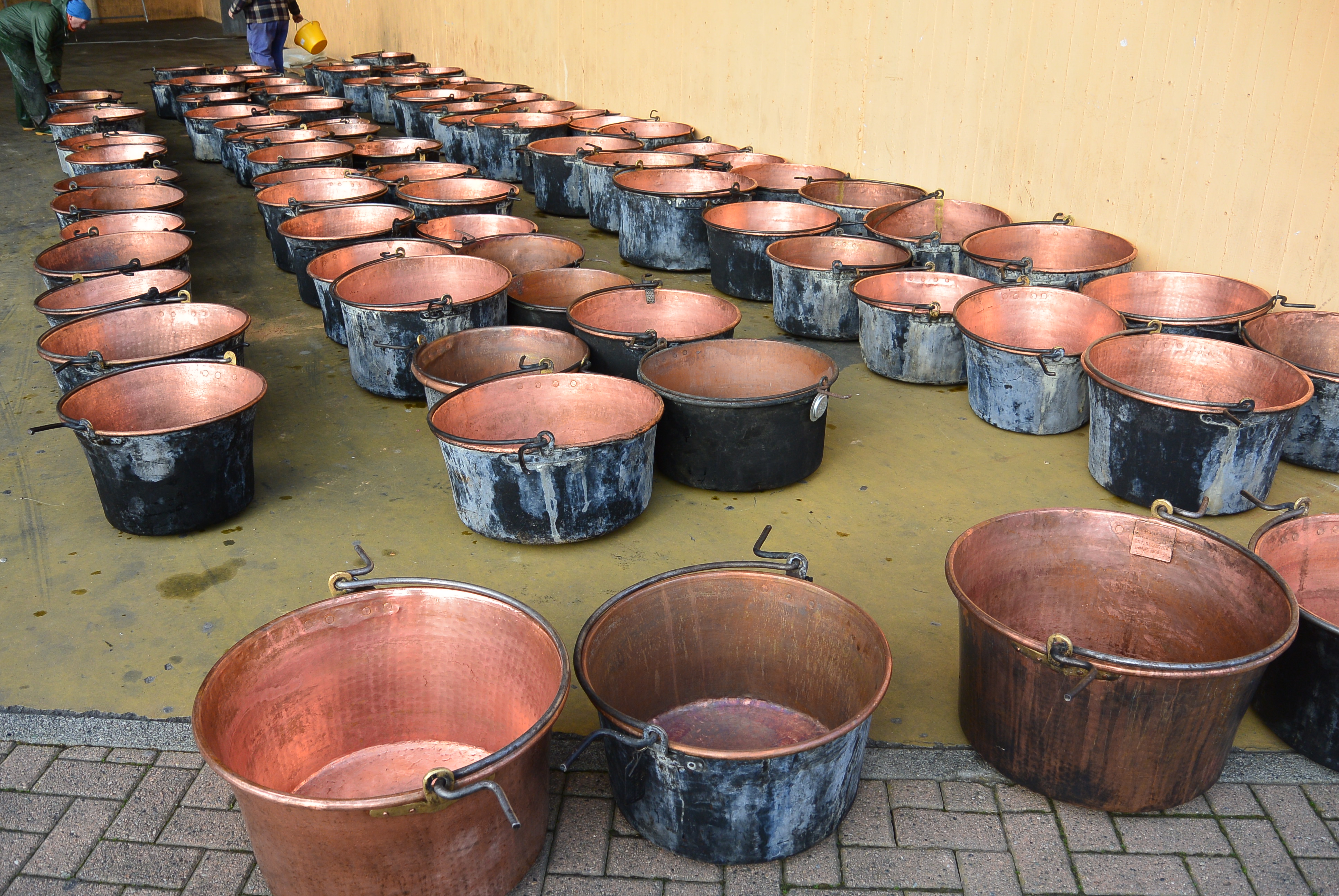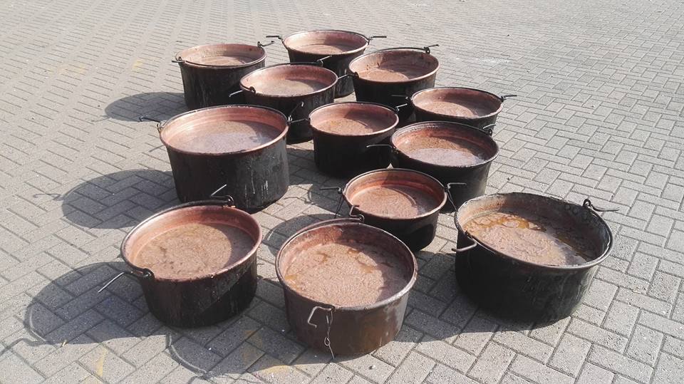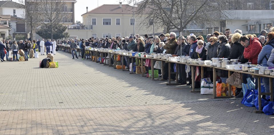 Sulle chilometriche tavole sono ammassati contenitori di ogni tipo che saranno tutti riempiti in pochi minuti. La distribuzione è curata da oltre 300 addetti divisi in 32 gruppi guidati dai cosidetti capipalina.