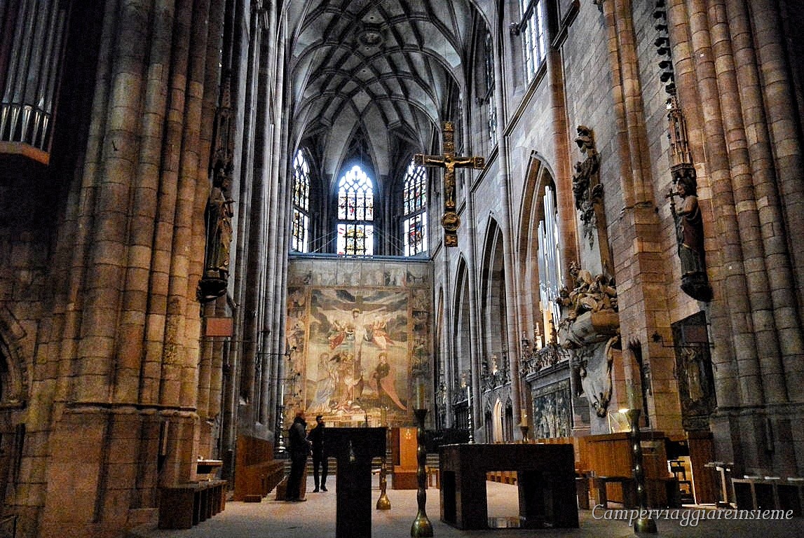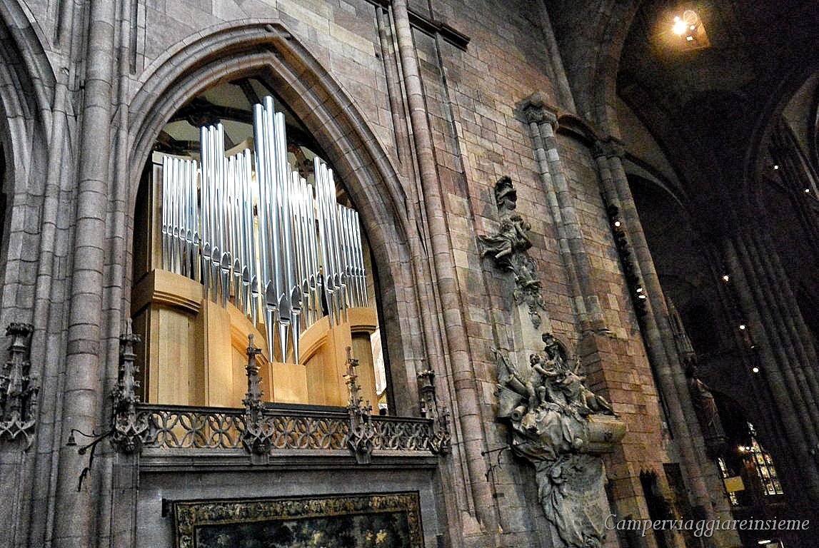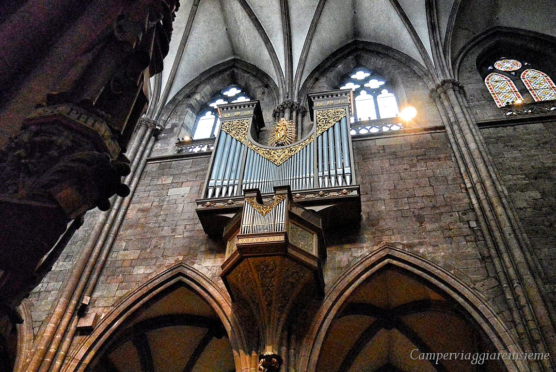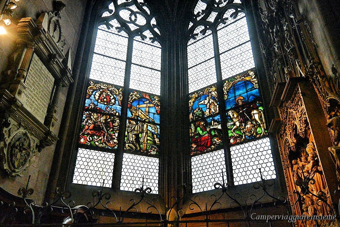 Entrando si osservano le sue bellissime vetrate che ritraggono panettieri, calzolai, sarti ecc., tutti mestieri svolti dai suoi abitanti, donatori che a quel tempo volevano la sua costruzione. Elemento particolare anche il suo organo suddiviso in 4 diverse parti della chiesa.